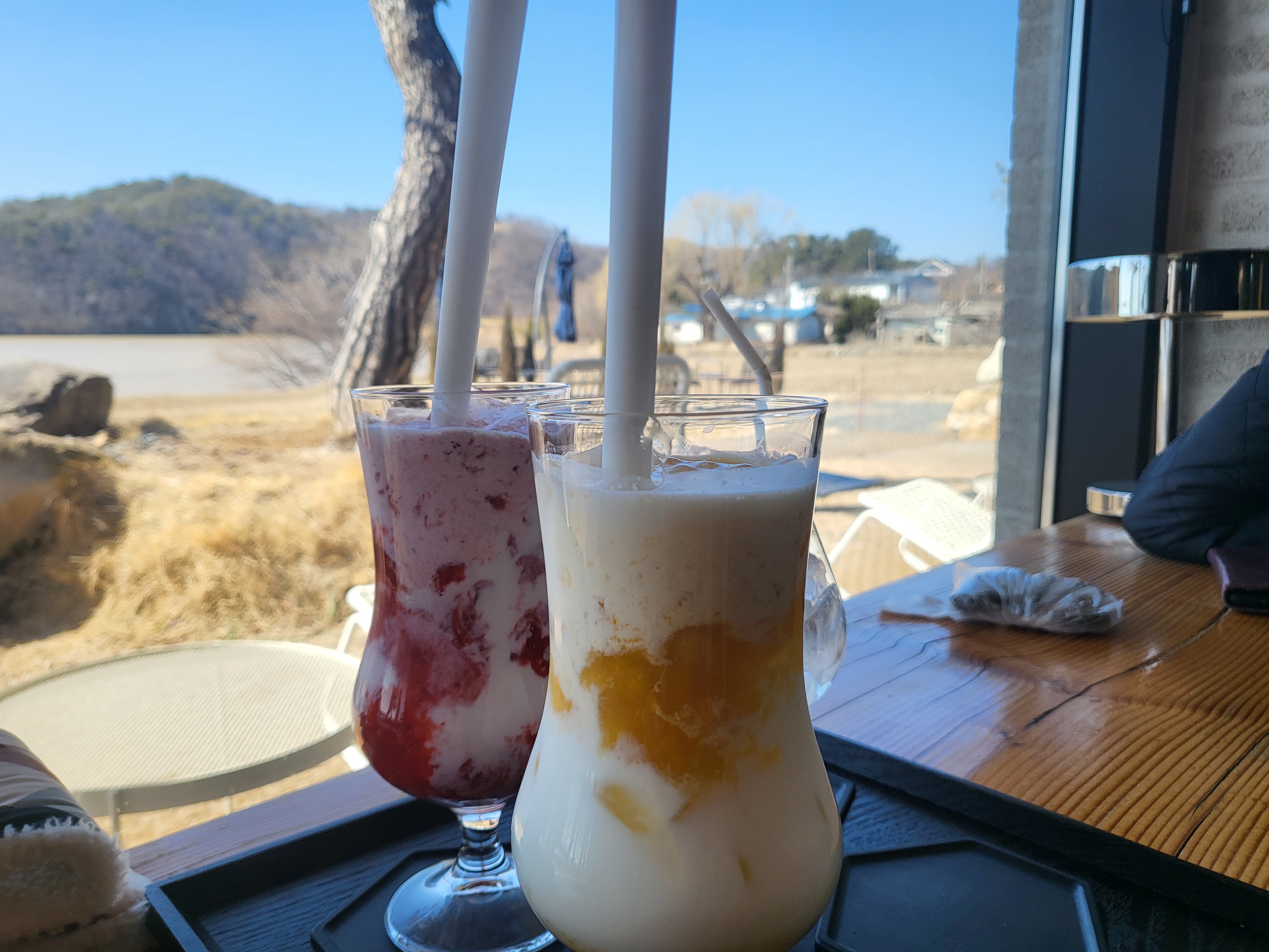 과일라떼 중에 우리는 딸기라떼와 망고라떼를 주문했다.
