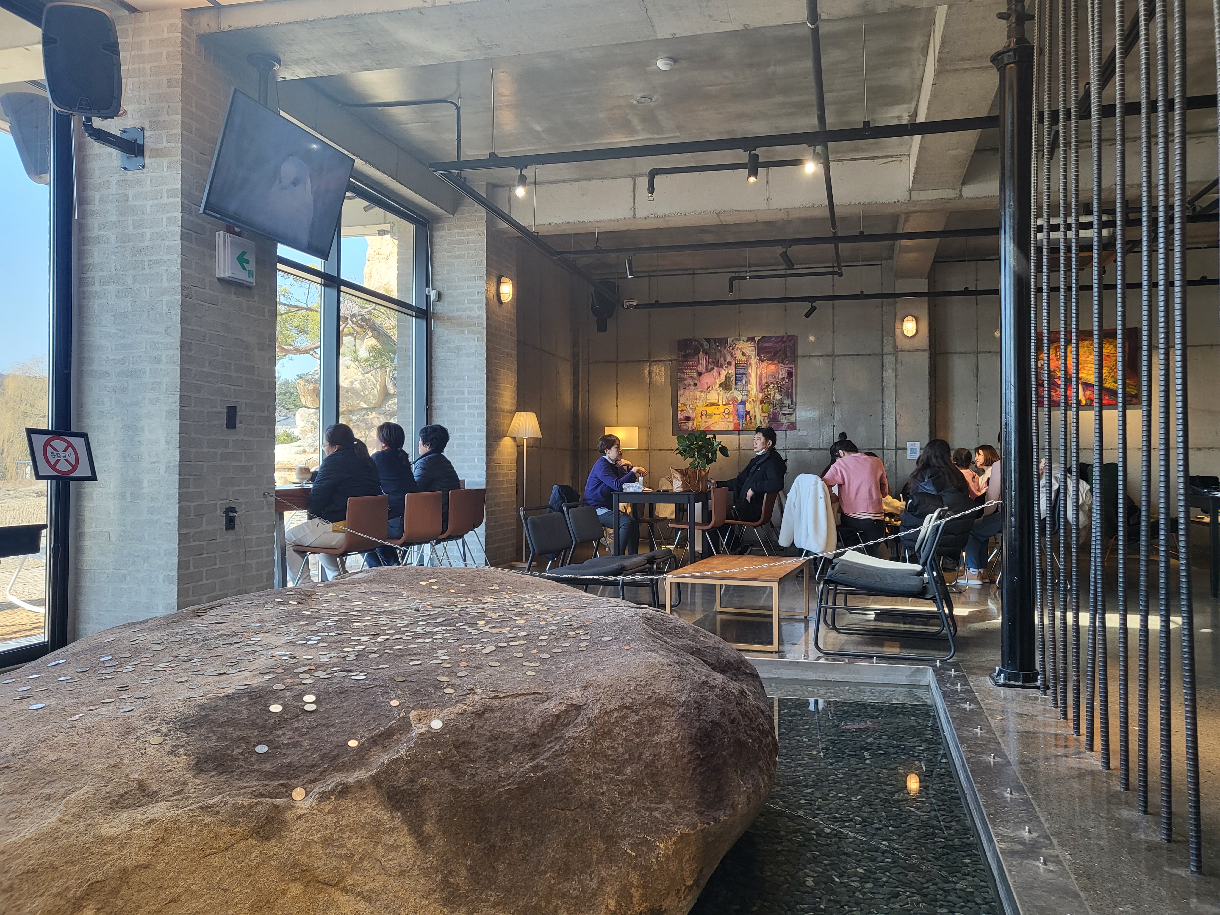 카페 한가운데 큰 바위가 있고 그 바위에는 많은 사람들이 소원을 비는 듯 많은 동전들이 있었습니다.
