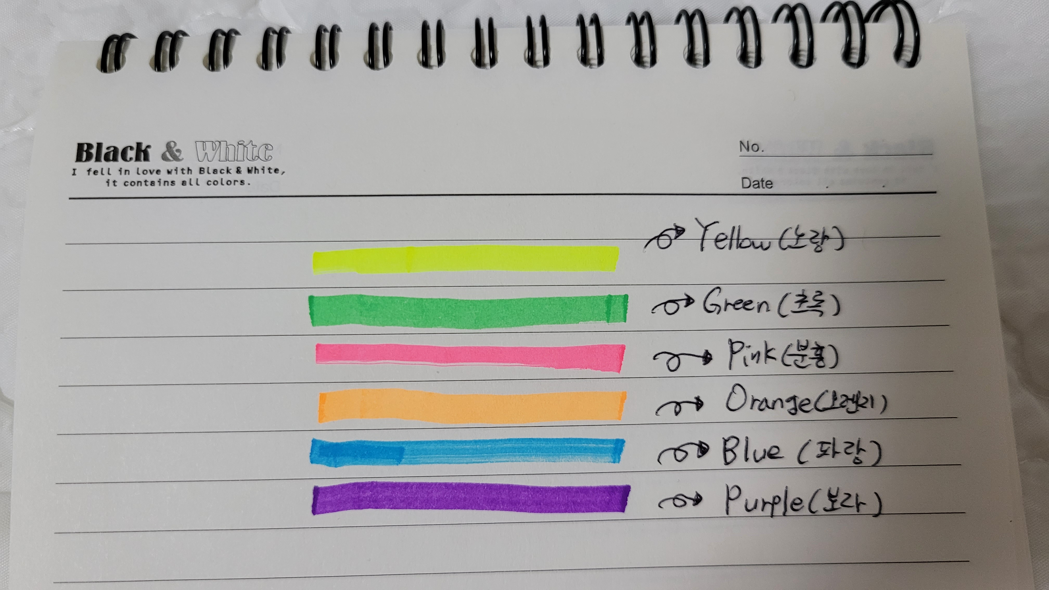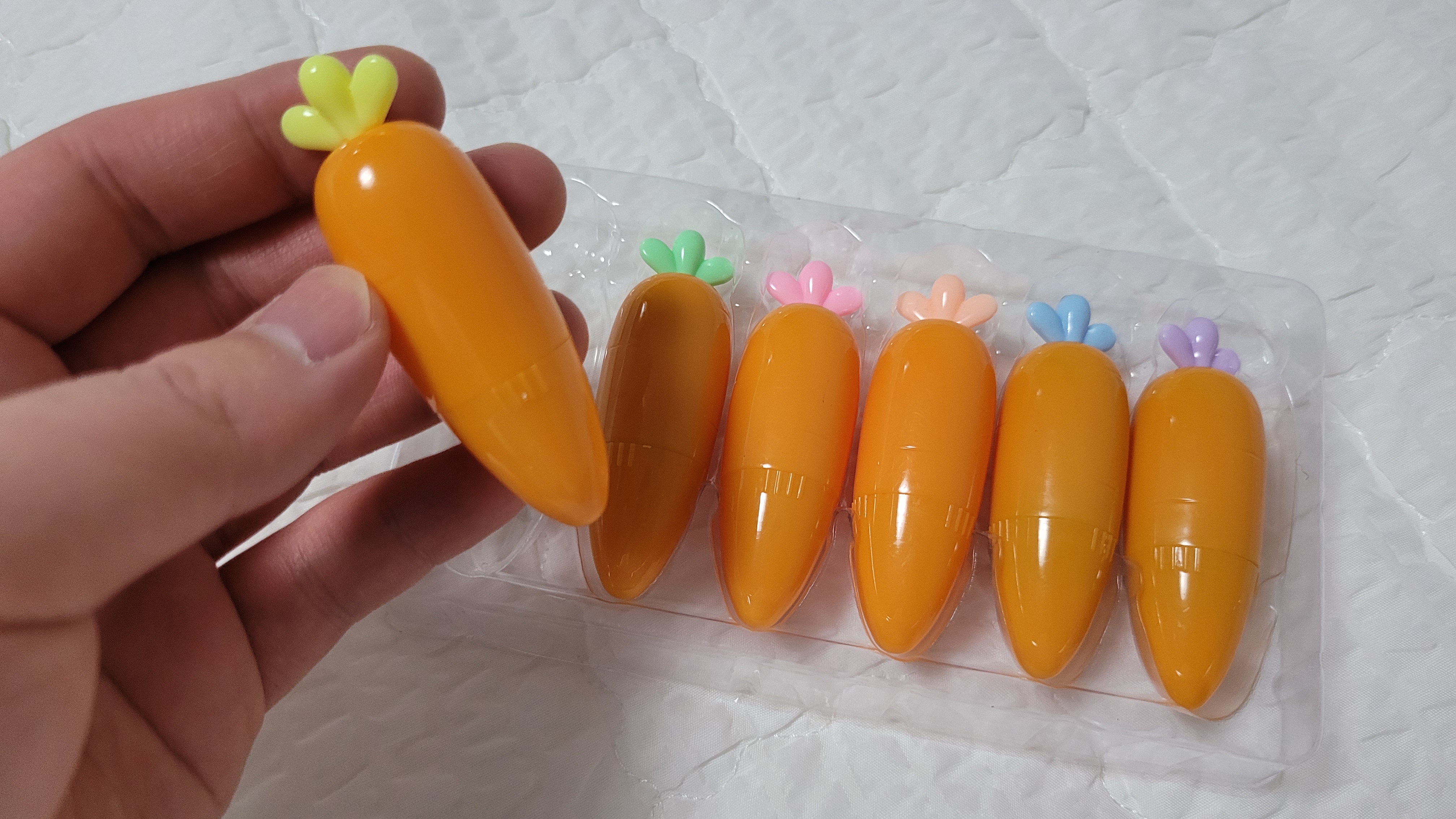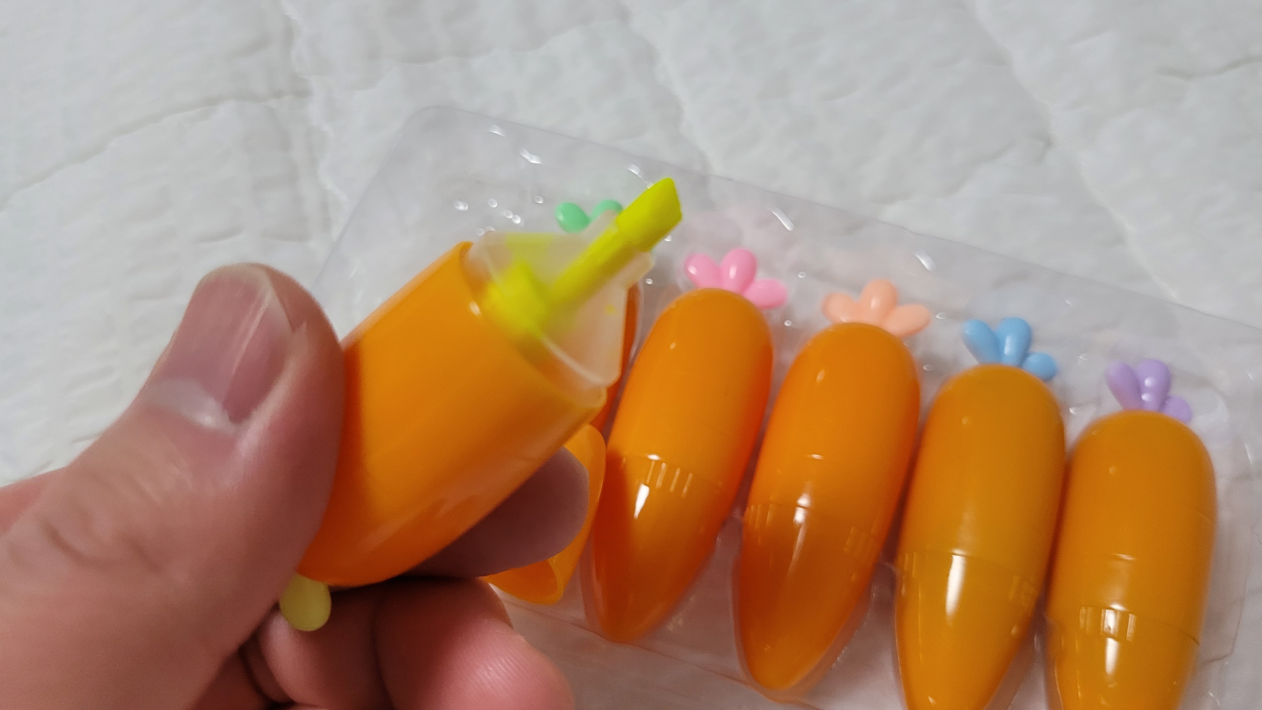 예상과 달리 하이라이터의 색상은 오히려 아주 어두운 음영입니다. 상단 색상을 보면 파스텔 색상과 비슷할 줄 알았는데 그렇지 않았습니다. 상의 색 때문에 샀는데.. 그 부분은 좀 아쉽긴 한데 귀여운 당근을 보니 오래 쓸 것 같아요.