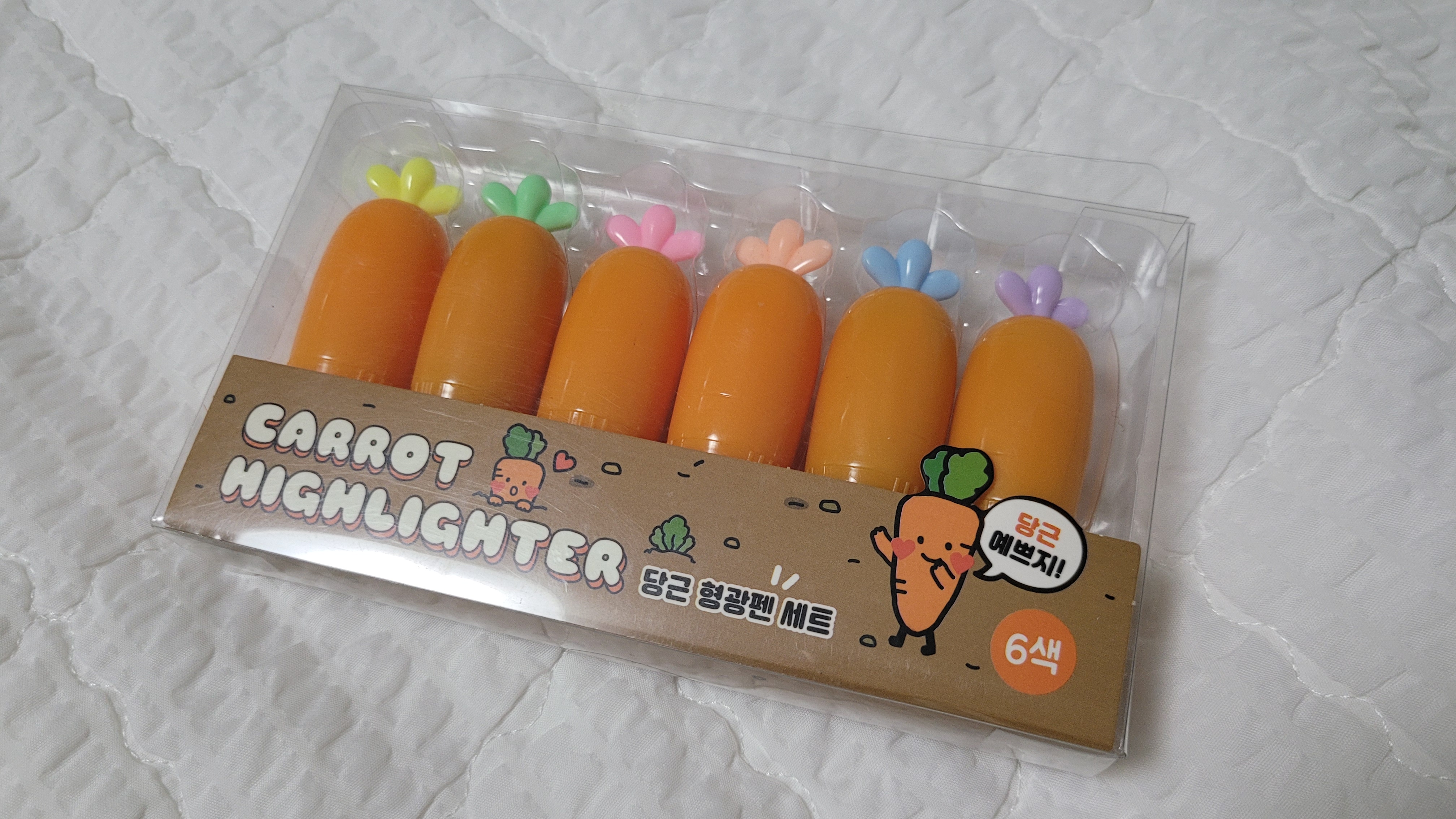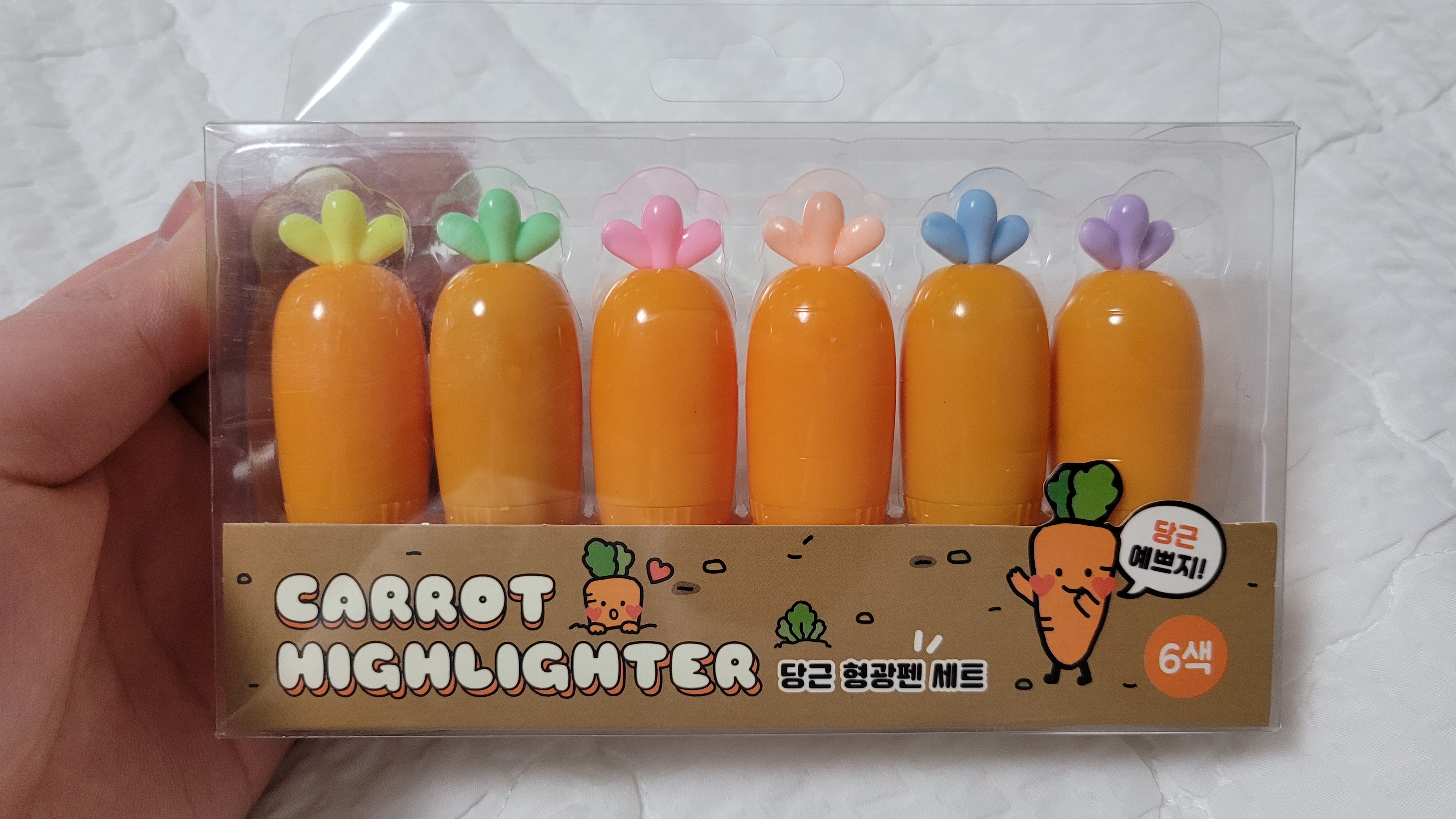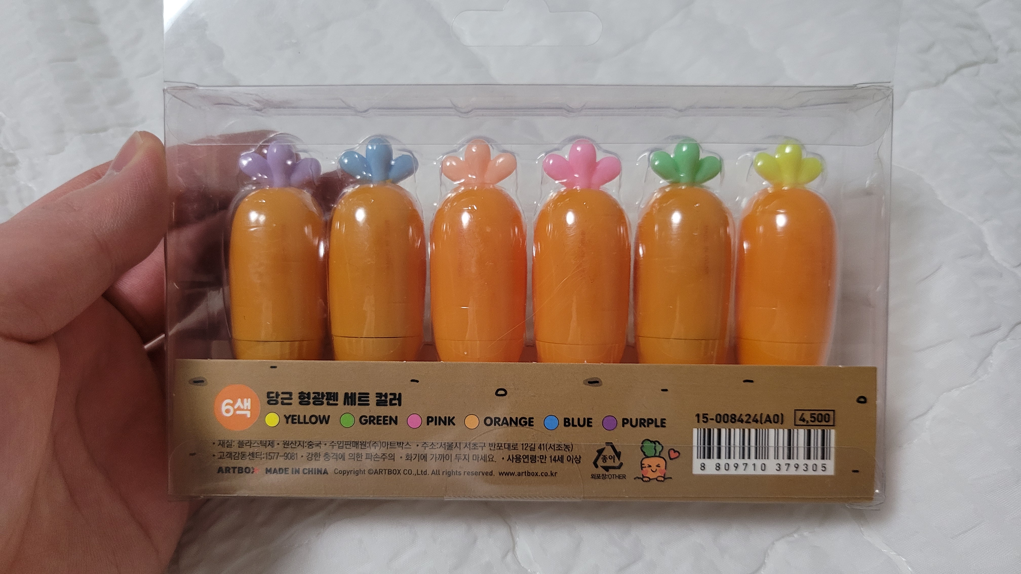 아트박스에는 다양한 종류의 형광펜이 있습니다. 대형 형광펜/아이스크림/매니큐어/하트/베어젤리/마카롱 등등… 여러가지가 있지만 오늘은 아트박스에서 방금 구입한 (당근 형광펜 세트)에 대한 후기를 남겨보려고 합니다.