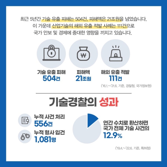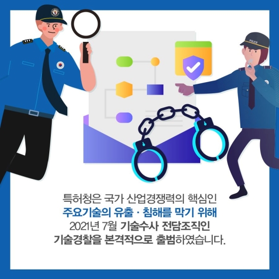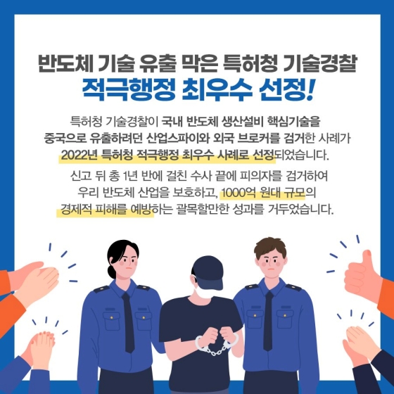 특히 반도체 기술 유출을 막는 특허청 기술경찰이 현 정부에서 최고로 선정돼 기술경찰의 필요성이 다시 높아졌다. 국내 반도체 기술은 세계 최고 수준으로 유출되면 국가에 막대한 손실을 입힐 것으로 예상되는 가운데, 국내 반도체 생산설비 핵심기술을 중국으로 유출하려던 산업스파이와 외국인 브로커가 검거돼 범인으로 지목됐다. 2022년에는 특허청의 적극행정 우수사례를 보고한 뒤 1년 반의 수사 끝에 피의자를 검거했고, 한국 반도체 산업 보호 효과는 1000억원에 달했다. 엄청나네요.