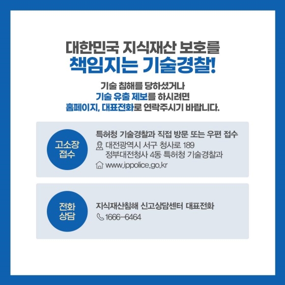 지적 재산은 지적 재산과 동일하지만 지적 재산은 무형 재산을 의미합니다. 인간의 뇌가 만들어내거나 표시한 무형의 이익이 특별한 관리 없이 해외로 유출되어 판매되어 국가에 막대한 손실을 초래하는 특허 전쟁으로 이어질 수 있는 독점권을 뉴스를 통해 알 수 있습니다. 안타깝게도. 하지만 지적재산권의 유출을 막는 보이지 않는 숨은 힘이 있다는 것을 알게 되었고, 그것이 바로 지적재산권입니다. 특허청 기술경찰이라는 제도가 있습니다. 지식재산청 지식재산청 기술경찰, 지식재산 유출 방지?
