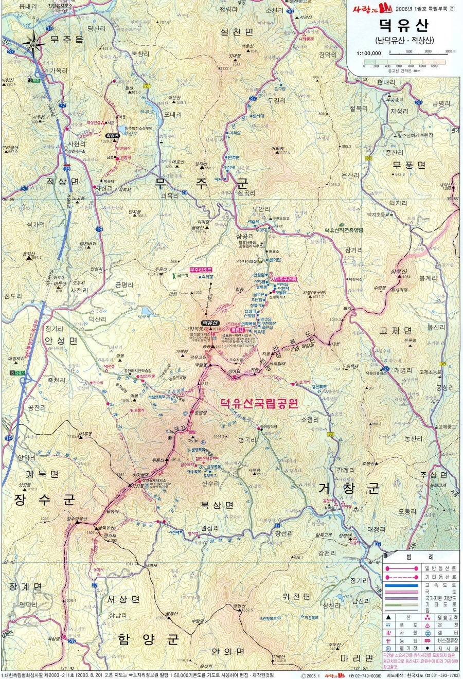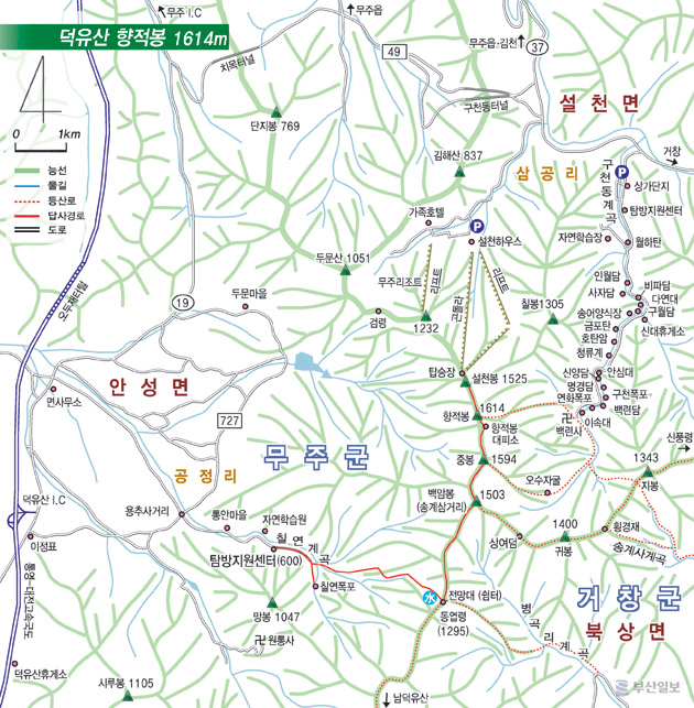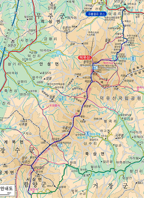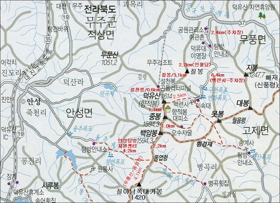 이 두 산이 이루는 능선을 중심으로 북서쪽으로는 적상산(赤裳山, 1,034m)과 두문산(斗文山, 1,052m), 거흘봉(居七峰, 1,178m)과 칠봉(七峰, 1,161m)이 있다. ) 북동쪽에 위치하고 있습니다. ), 남서쪽에는 삿갓봉(1,419m)과 무룡산(1,492m)이 1,000m가 넘는 일련의 고산산맥을 이루고 있어 덕유산맥이라고도 한다.