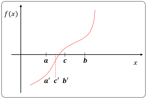 - f(c)가 0에 가깝지 않으면 f(c)의 부호가 f(a)이면 (c, b)로 간격을 좁히고 f(c)의 부호가 f(b)이면 (a, c ) 간격을 좁힙니다.