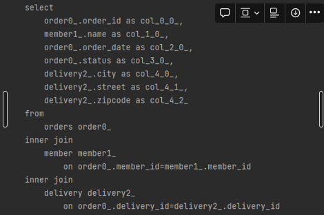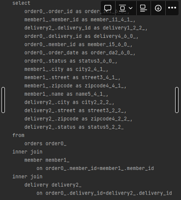 아래와 같이 Fetch Join을 이용하여 오더를 가져오면 연결된 멤버 테이블과 배송 테이블이 한번에 묶음으로 가져옵니다.